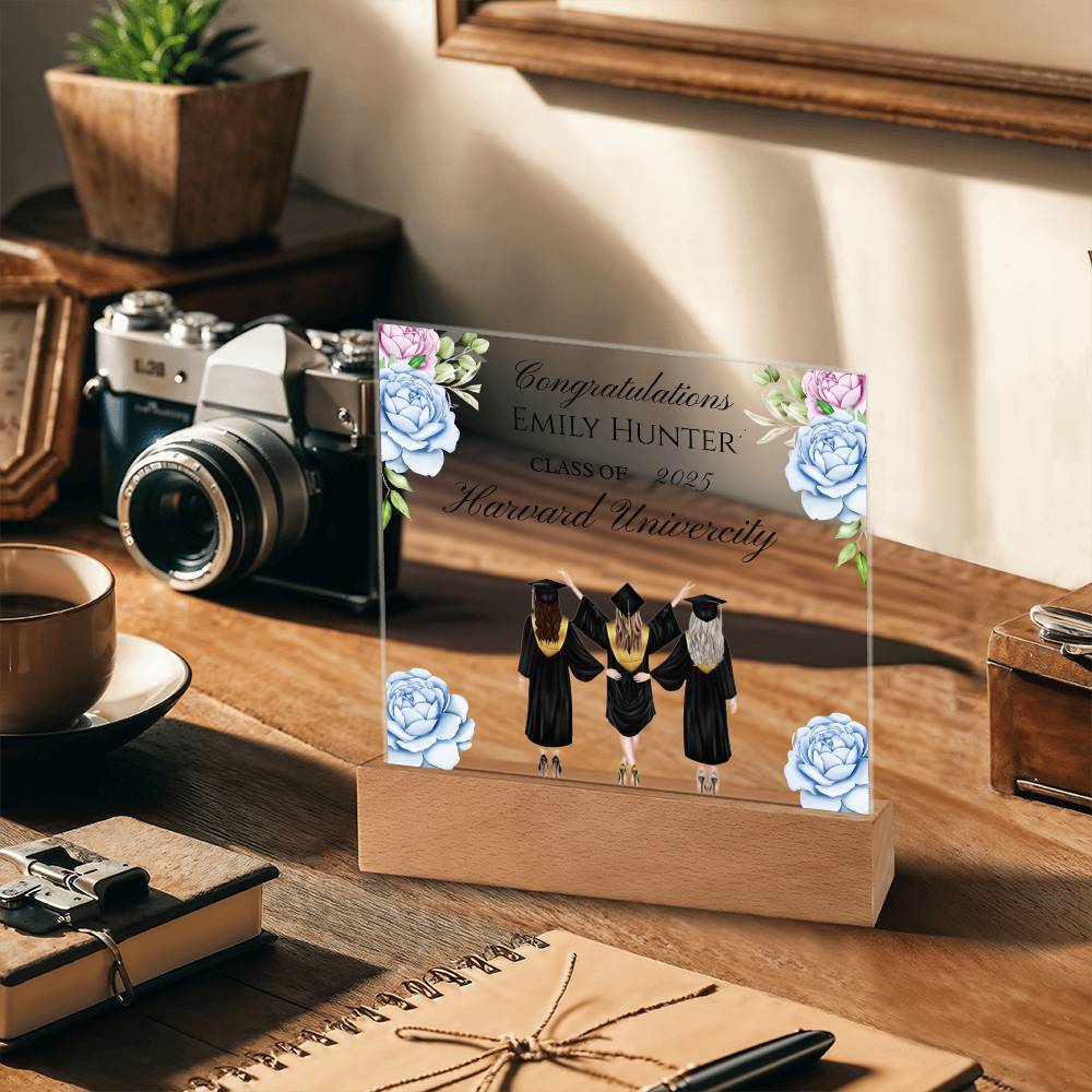 Your plaque will be crafted from premium acrylic with a professionally printed design for a polished look. It comes with a stylish wooden LED base, and you can choose between a USB plug-in option OR a cordless battery-operated option (requires 2 AAA batteries, not included). Both LED bases feature 7 vibrant colors, allowing the user to customize the lighting with various color changes and dynamic cycles.