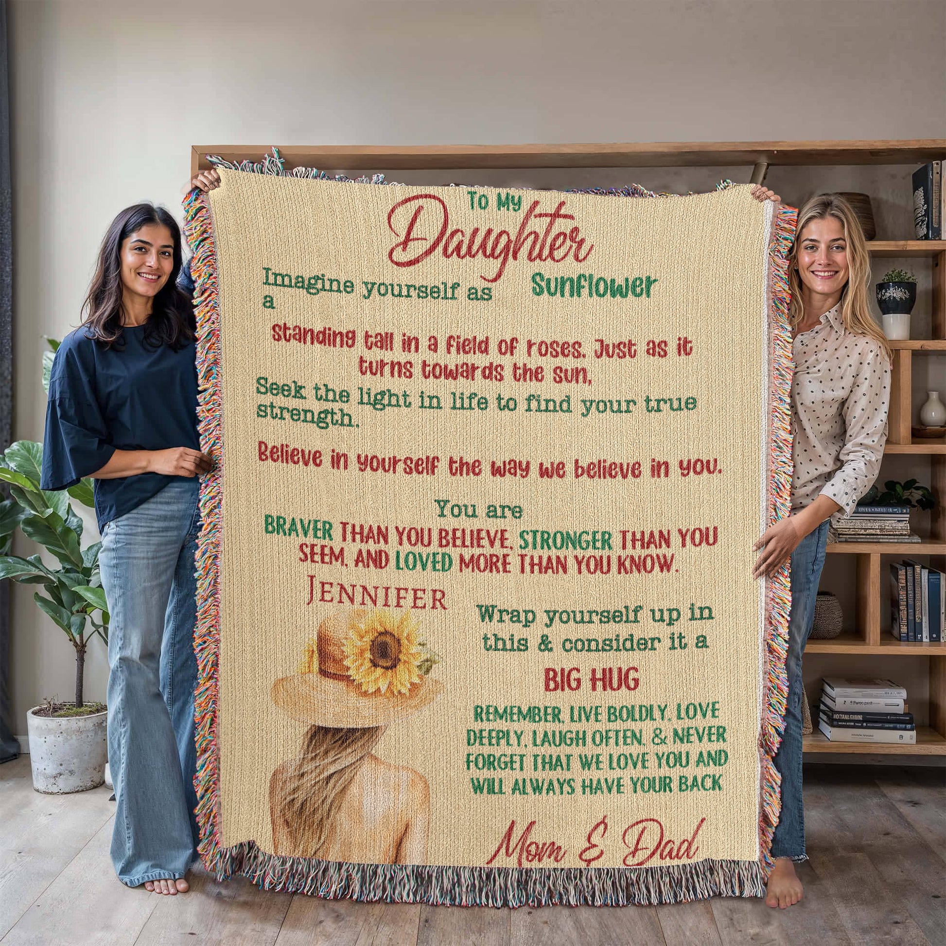 Celebrate the unbreakable bond between a parent and their daughter with this beautifully personalized photo blanket. Featuring her name and cherished memories turned into a stunning keepsake, this gift is more than just a blanket—it’s a heartfelt reminder of love, pride, and the special moments you share. Perfect for Christmas, birthdays, or any occasion to make her feel truly special. Choose from Heirloom woven, sherpa, or fleece blankets.