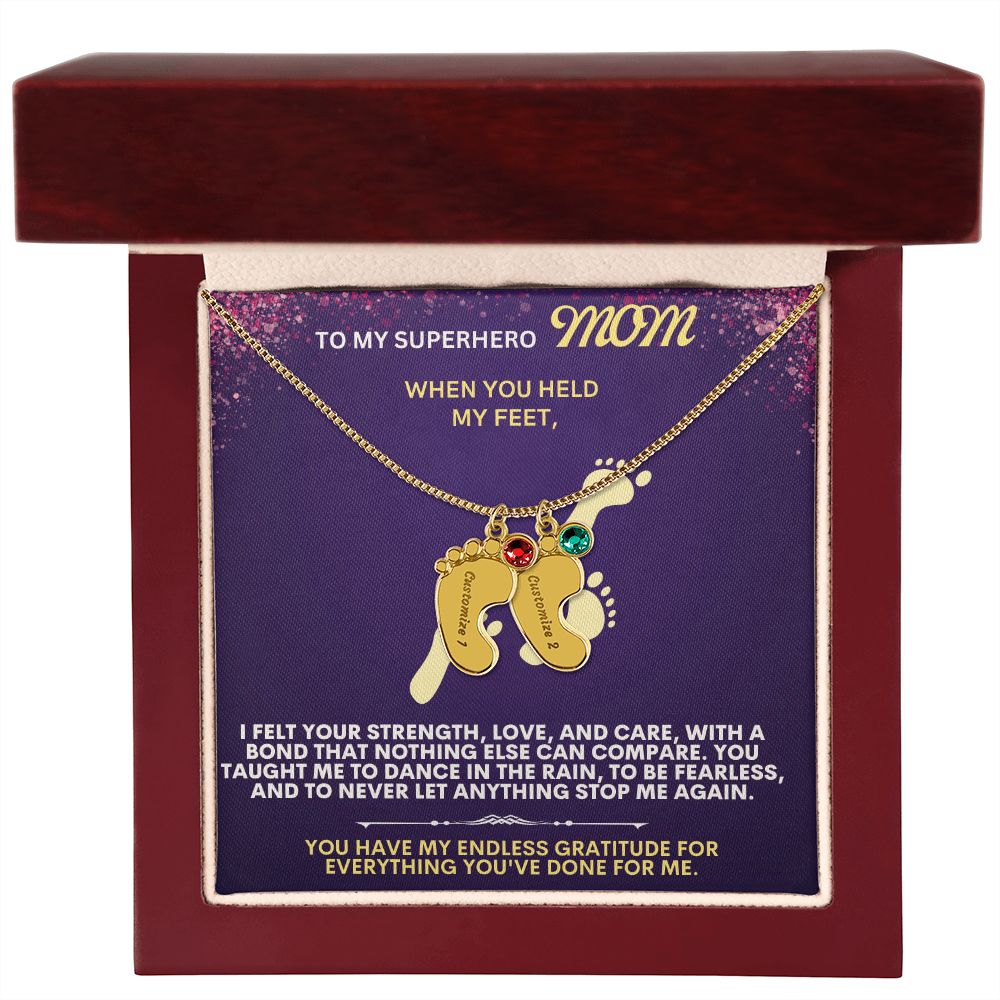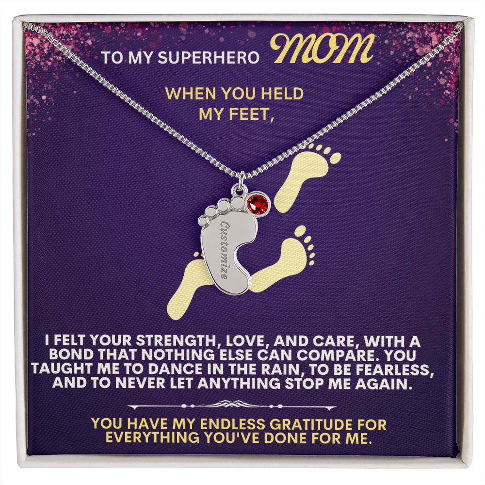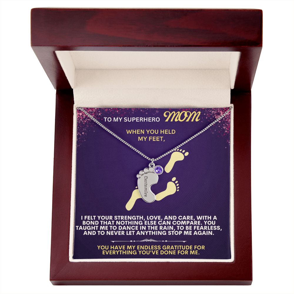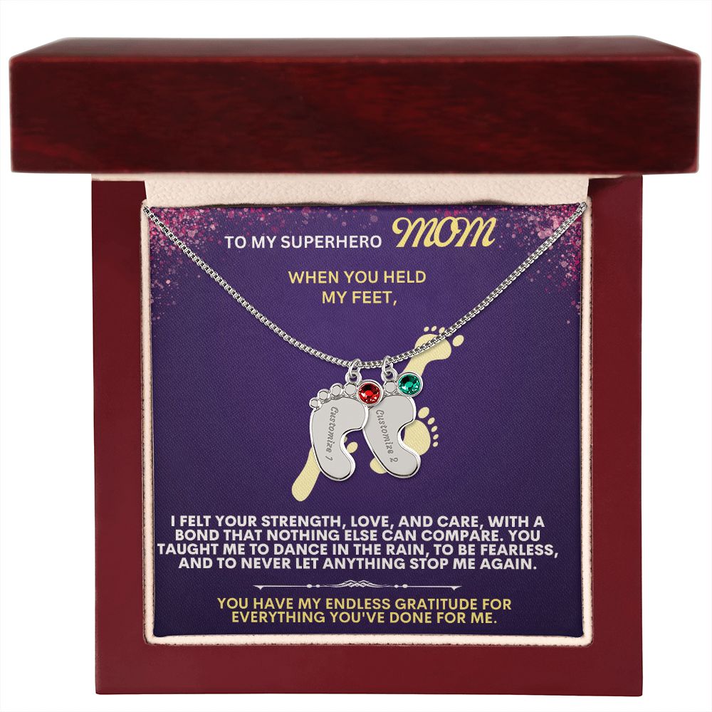 Celebrate the arrival of a newborn or cherish a precious memory with our Custom Baby Feet Necklace with Birthstone. Personalize your gift by engraving a name of your choice onto the pendant and choosing a crystal that correlates with the baby's birth month. And by picking multiple pendants, a custom present like this is perfect for moms and grandmothers with big families. This is a one-of-a-kind keepsake that will be treasured for a lifetime!