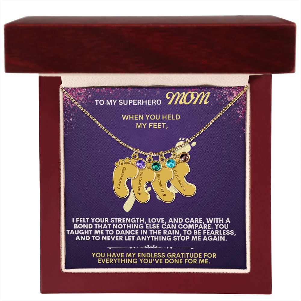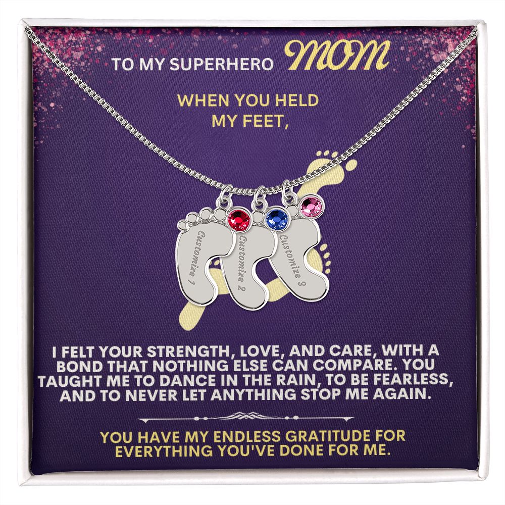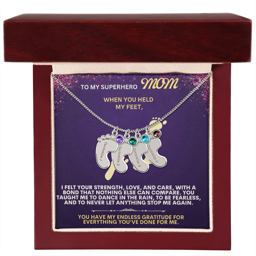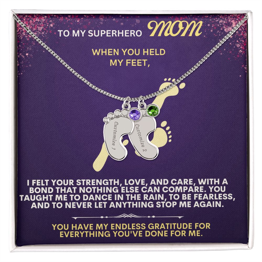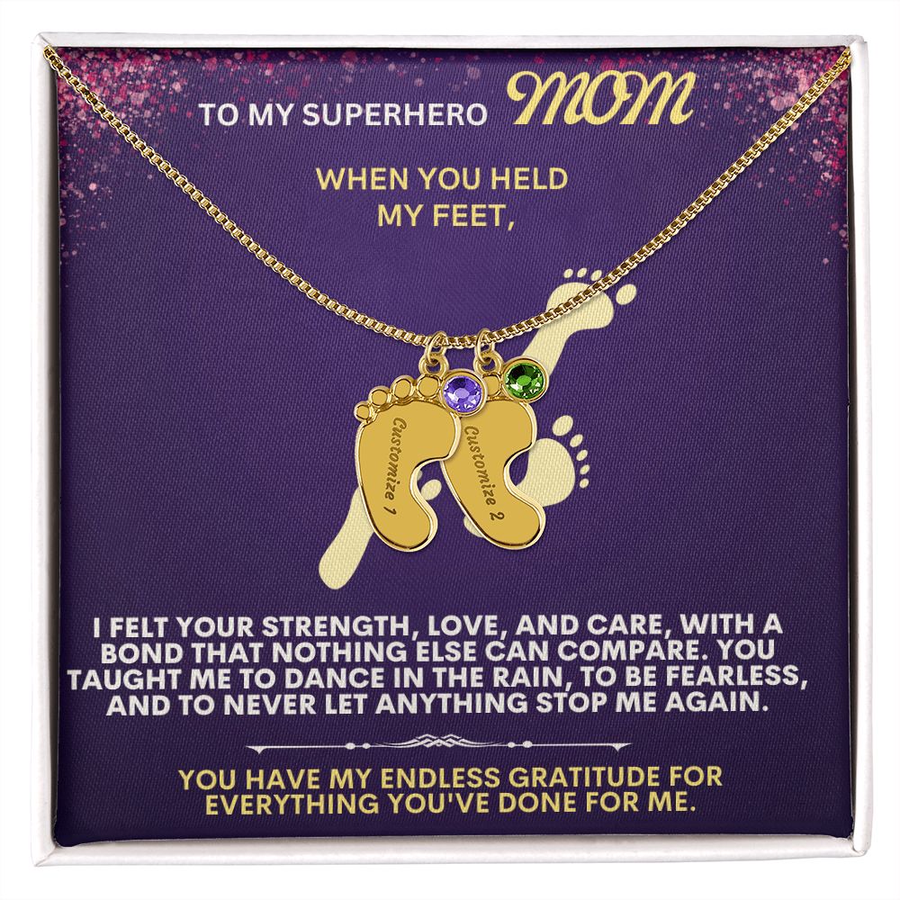 Celebrate the arrival of a newborn or cherish a precious memory with our Custom Baby Feet Necklace with Birthstone. Personalize your gift by engraving a name of your choice onto the pendant and choosing a crystal that correlates with the baby's birth month. And by picking multiple pendants, a custom present like this is perfect for moms and grandmothers with big families. This is a one-of-a-kind keepsake that will be treasured for a lifetime!
