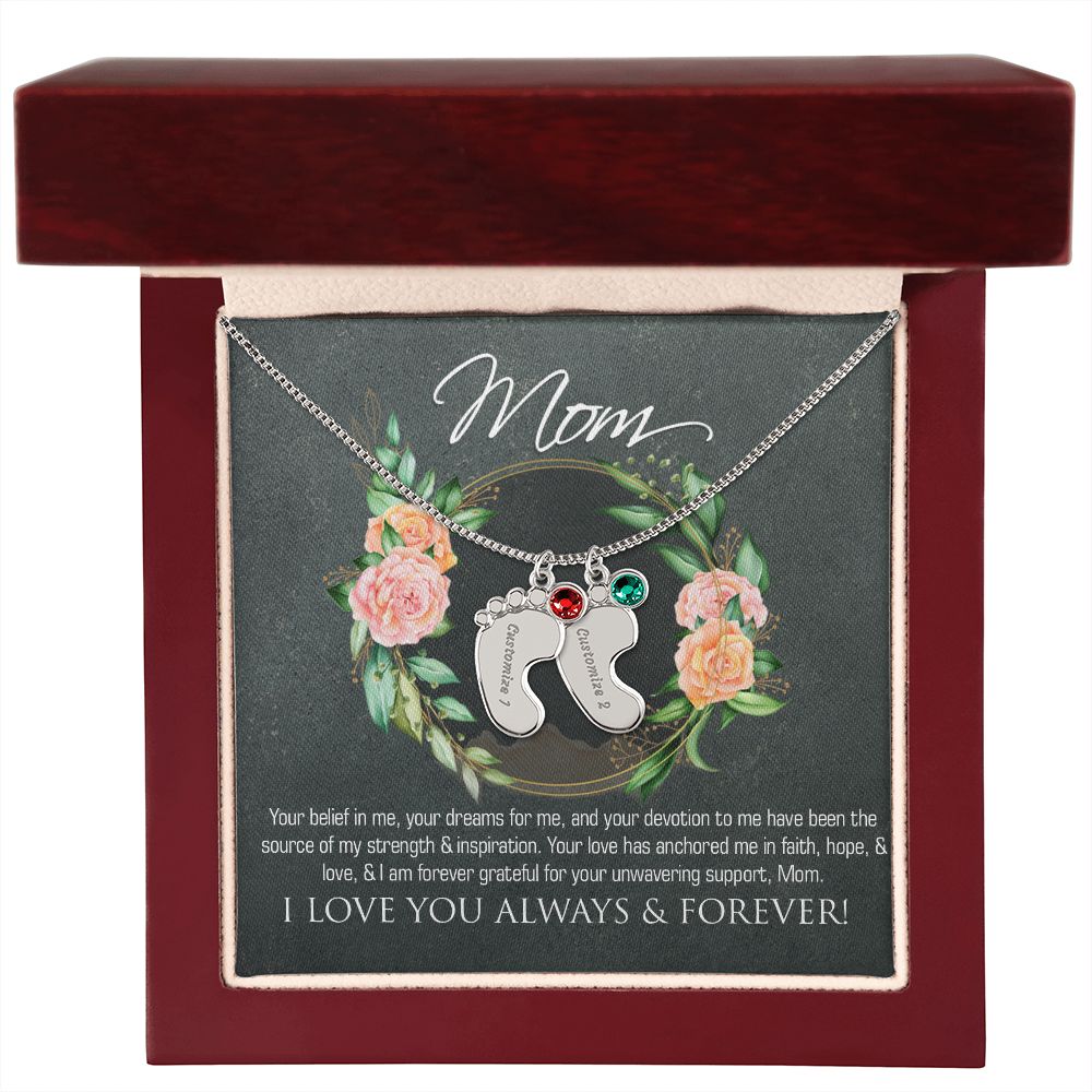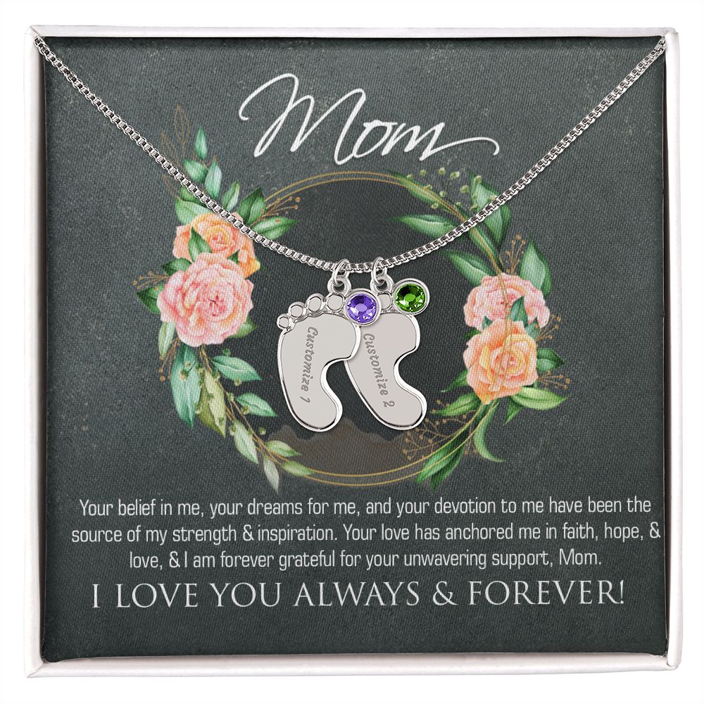 Celebrate the arrival of a newborn or cherish a precious memory with our Custom Baby Feet Necklace with Birthstone. Personalize your gift by engraving a name of your choice onto the pendant and choosing a crystal that correlates with the baby's birth month. And by picking multiple pendants, a custom present like this is perfect for moms and grandmothers with big families. This is a one-of-a-kind keepsake that will be treasured for a lifetime!