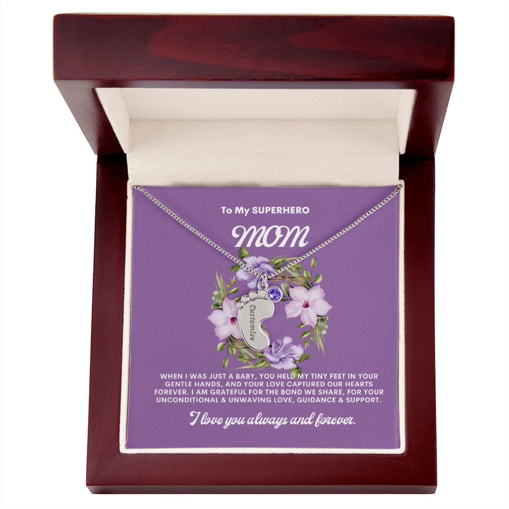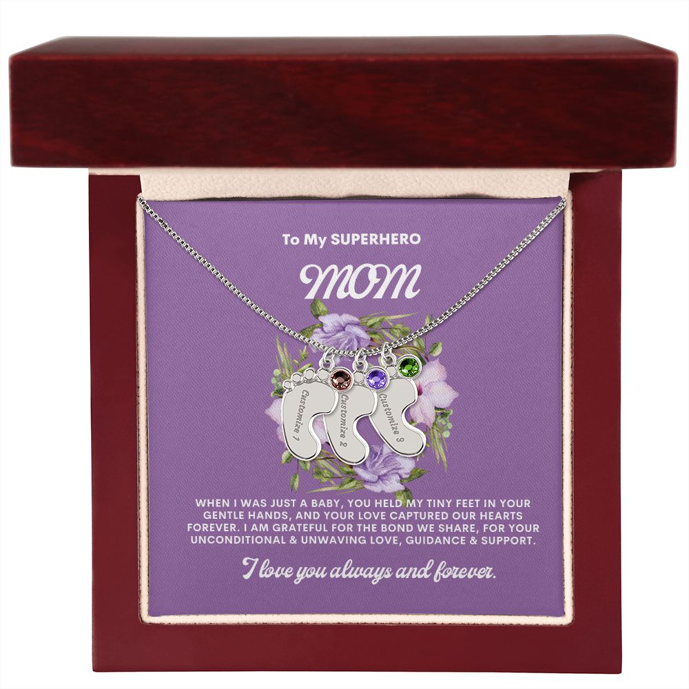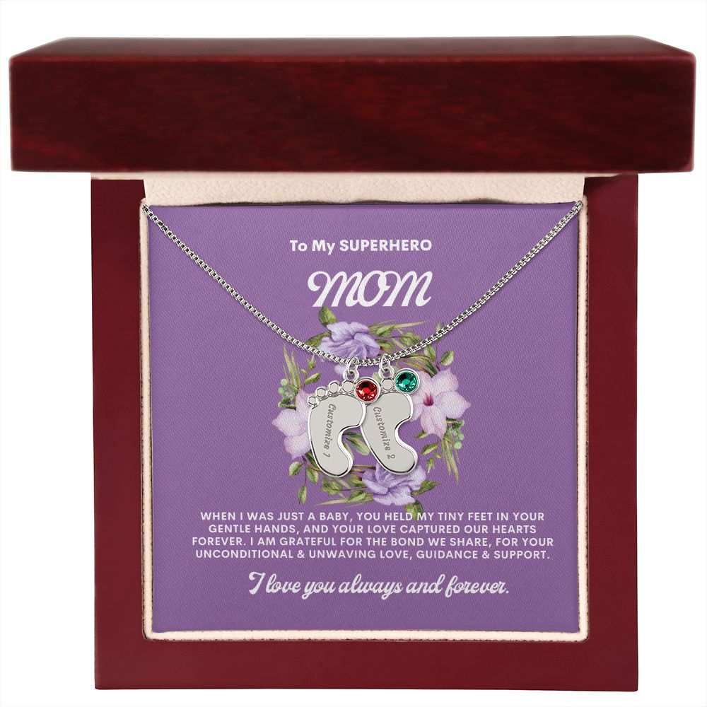 Celebrate the arrival of a newborn or cherish a precious memory with our Custom Baby Feet Necklace with Birthstone. Personalize your gift by engraving a name of your choice onto the pendant and choosing a crystal that correlates with the baby's birth month. And by picking multiple pendants, a custom present like this is perfect for moms and grandmothers with big families. This is a one-of-a-kind keepsake that will be treasured for a lifetime!