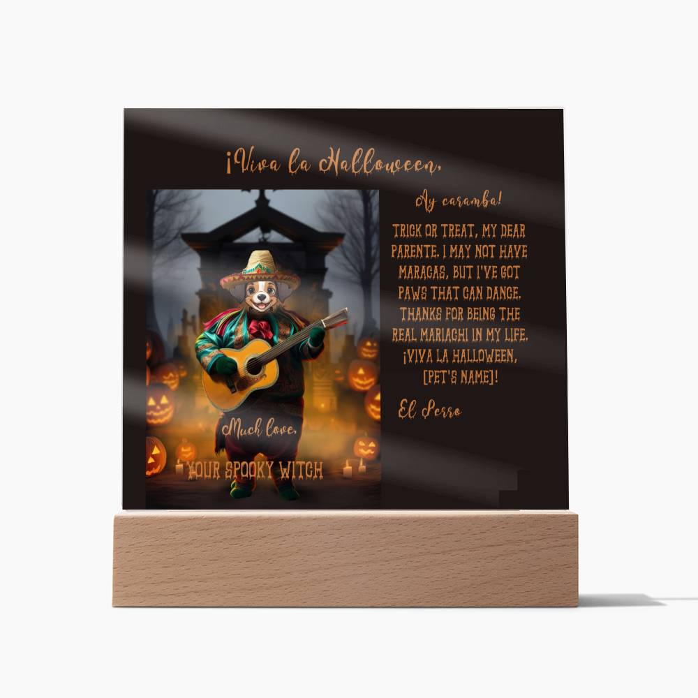 Halloween portrait of your pet: your Dog dressed up as a Mexicano, on a square acrylic plaque with ¡Viva la Halloween, “Halloween is the perfect excuse to serenade you with purrs and love. Thanks for letting me strum the strings of your heart.” message from a dog to Mom, a gift from a husband, a child and a pet with Halloween wishes written in Latino lingo. An ideal, entertaining, sentimental, and unforgettable table home décor present ideal for a mama.