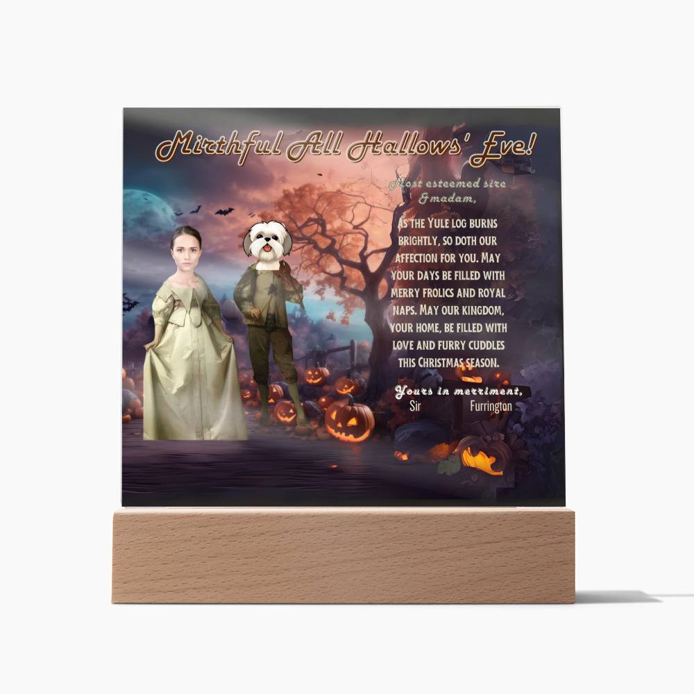 Personalized Halloween Acrylic Plaque for a Dog Mom with a Portrait of a Dressed Up in Early XX Century Costume with Customizable Dog and Mom faces. Funny and Sentimental Halloween Wishes . A Table Home Décor Lamp, Gift from Husband and or Children.