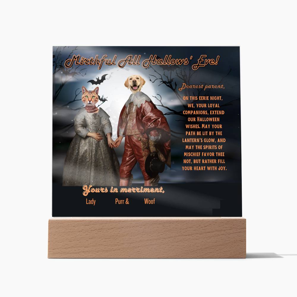 Personalized “Halloween Mirthful All Hallows' Eve Acrylic Plaque for Dog Cat Mom, a Portrait of Cat and Dog Dressed Up in Historical Costumes with faces. Funny and Sentimenta text. Gift from Husband, Children and Pets in a form of A Table Home Décor Lamp