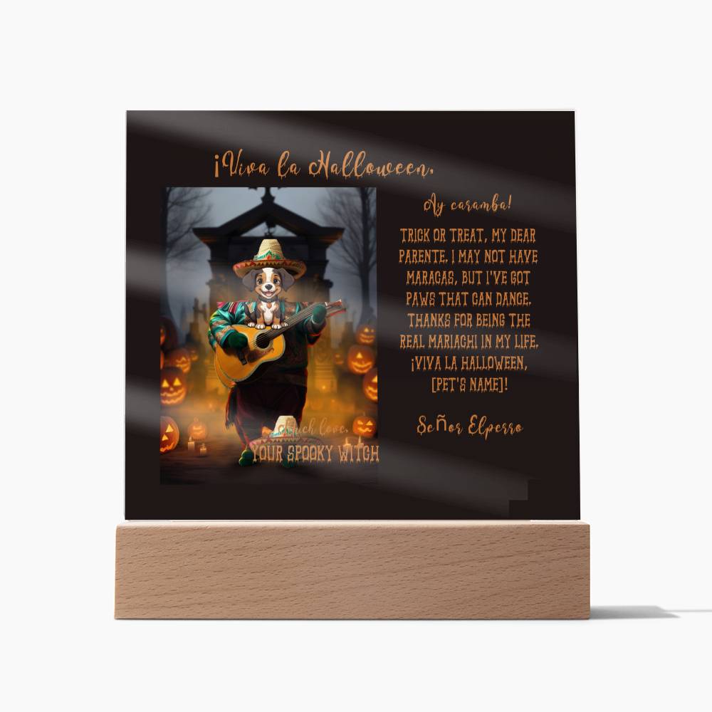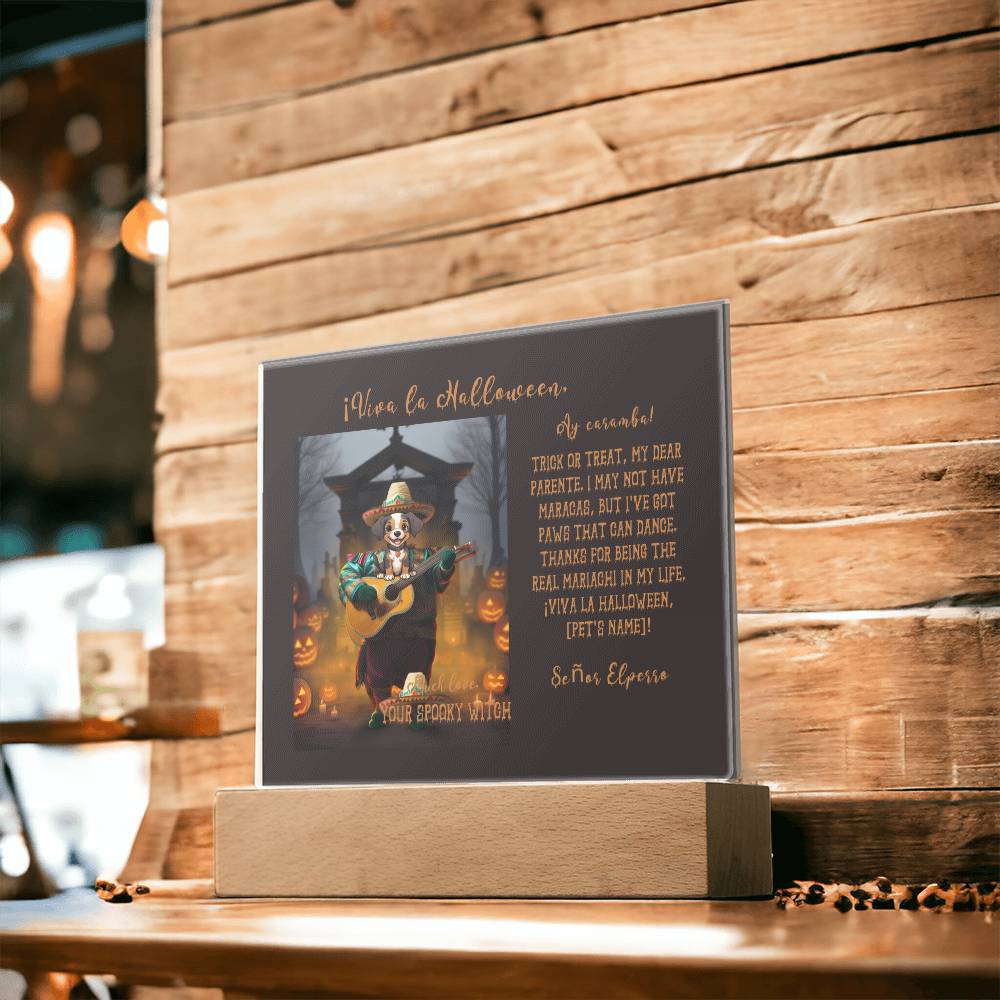Mariachi Dog Portrait on a square acrylic plaque with Viva la Hallow’en message from a dog to Mom or Dad, a gift from a husband, or / and children with Halloween wishes are written in an Latino Lingo to Parents: Mom & or Dad, from a pet. An ideal, entertaining, very emotional and unforgettable gift for mother father, mama or daddy.
