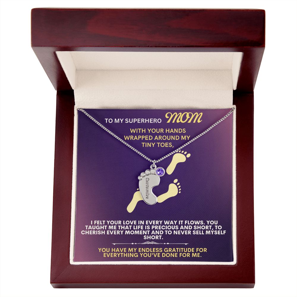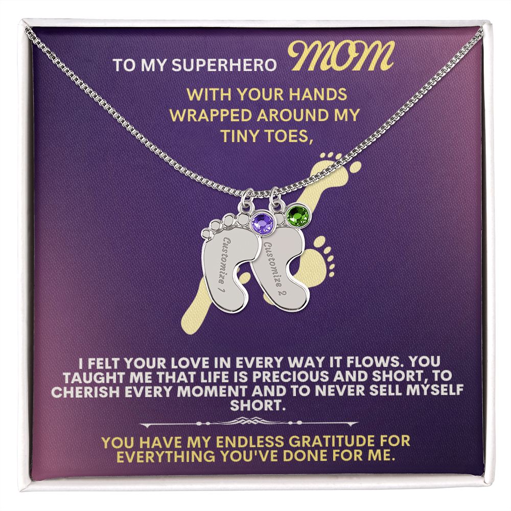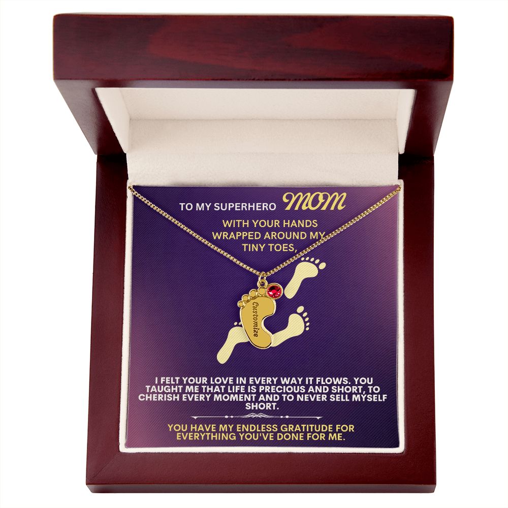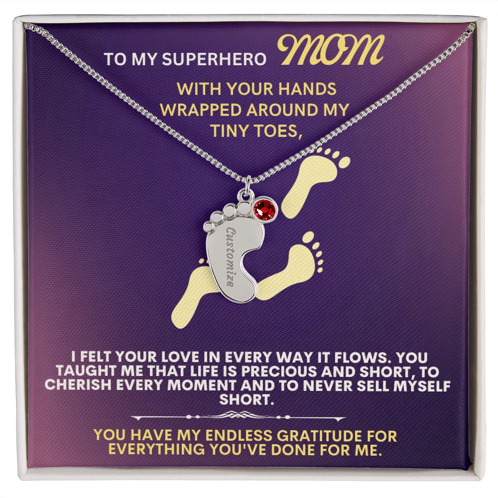 Celebrate the arrival of a newborn or cherish a precious memory with our Custom Baby Feet Necklace with Birthstone. Personalize your gift by engraving a name of your choice onto the pendant and choosing a crystal that correlates with the baby's birth month. And by picking multiple pendants, a custom present like this is perfect for moms and grandmothers with big families. This is a one-of-a-kind keepsake that will be treasured for a lifetime!