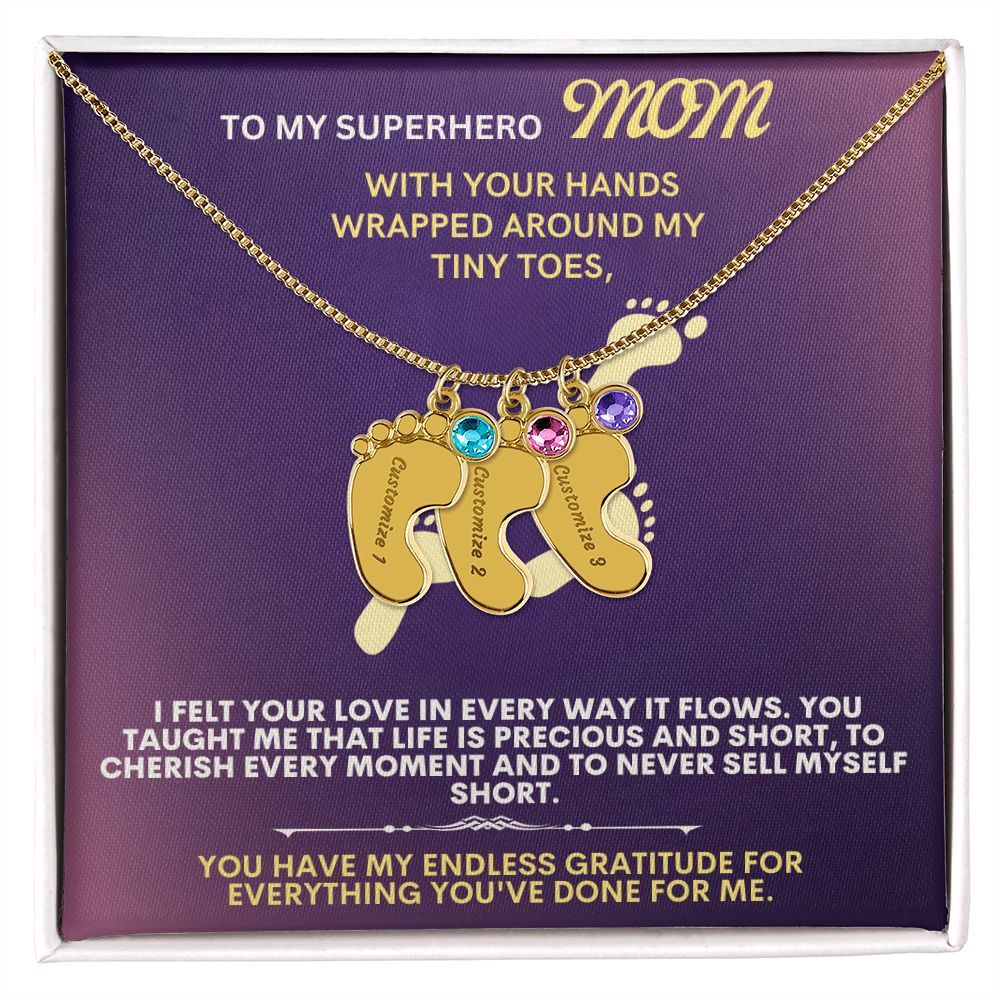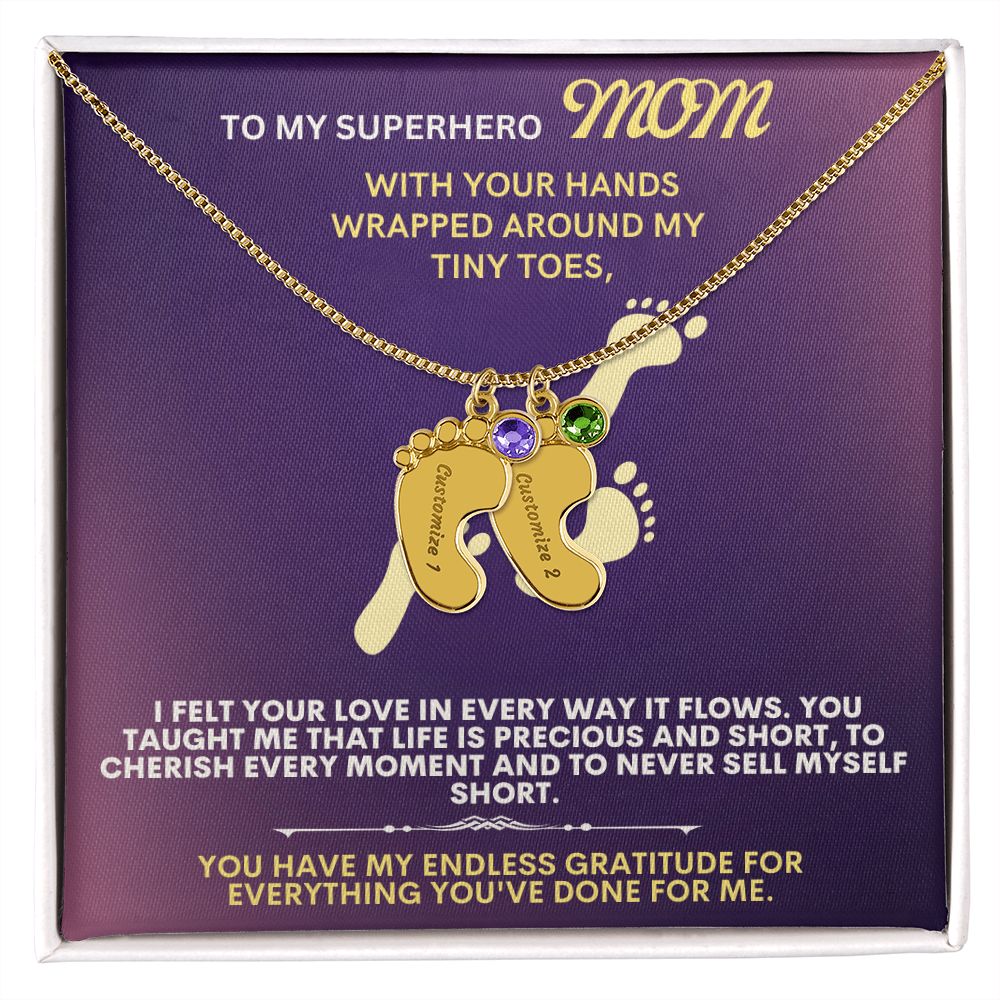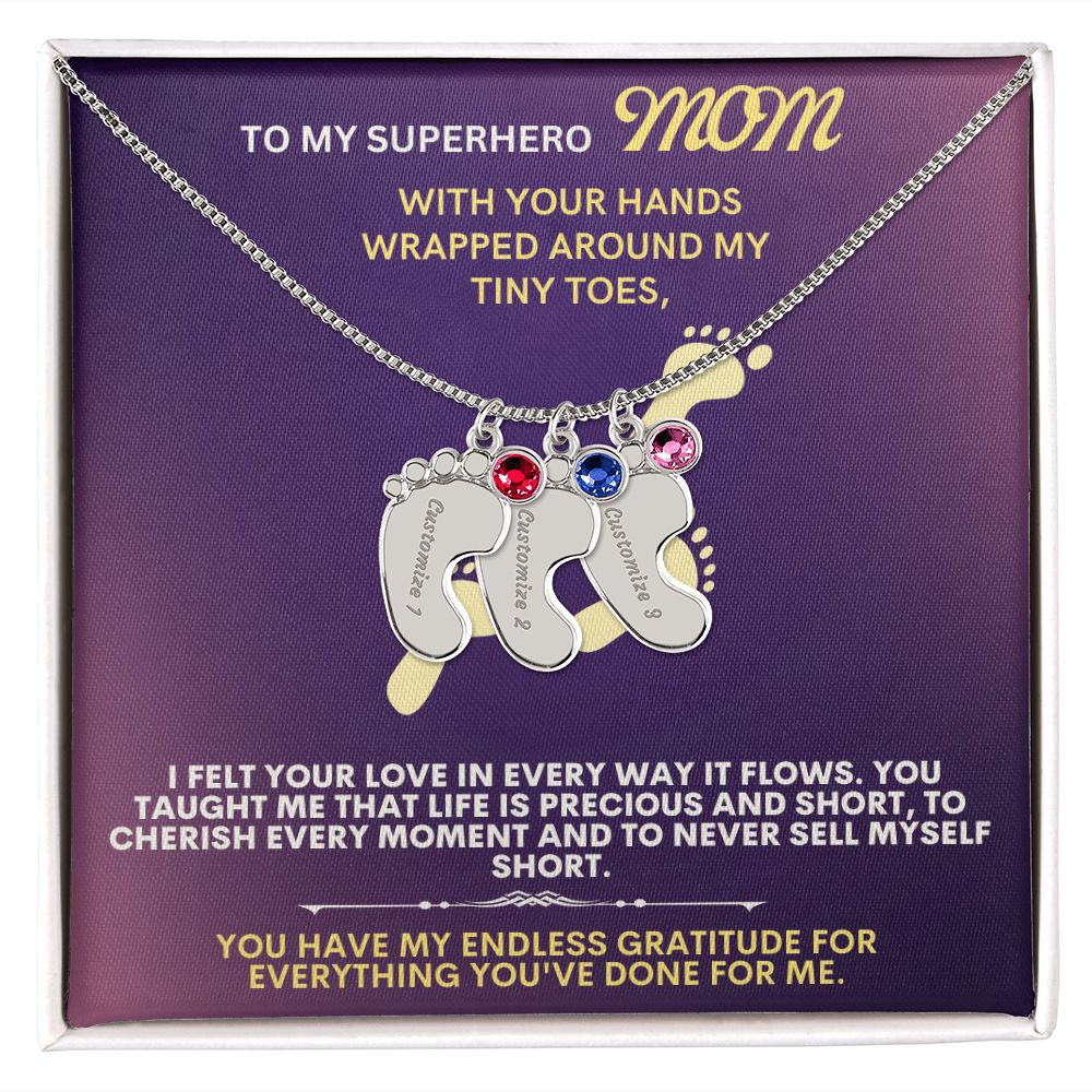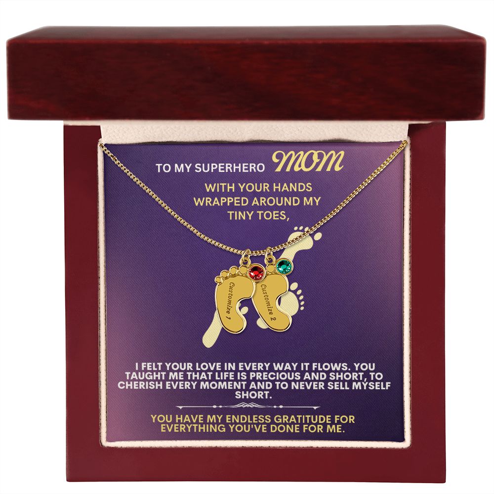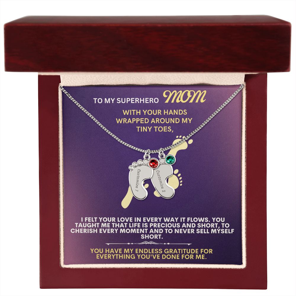 Celebrate the arrival of a newborn or cherish a precious memory with our Custom Baby Feet Necklace with Birthstone. Personalize your gift by engraving a name of your choice onto the pendant and choosing a crystal that correlates with the baby's birth month. And by picking multiple pendants, a custom present like this is perfect for moms and grandmothers with big families. This is a one-of-a-kind keepsake that will be treasured for a lifetime!